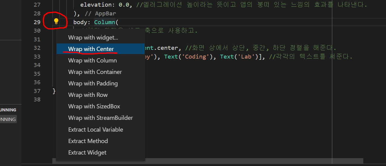 2. 앱의 바디 부분을 꾸며준다. 1) 앱의 바디의 색을 꾸며 준다. 2) 끌씨를 넣어주고, 글씨에 대한 효과(굵게, 하얀색, 글씨의 간격)을 적용 해본다. - Color를 선택할때 Colors.불라 불라 이름을 넣고 마우스 포인트를 올리면 색을 고를 수 있다. 위아래로 스크롤 가능